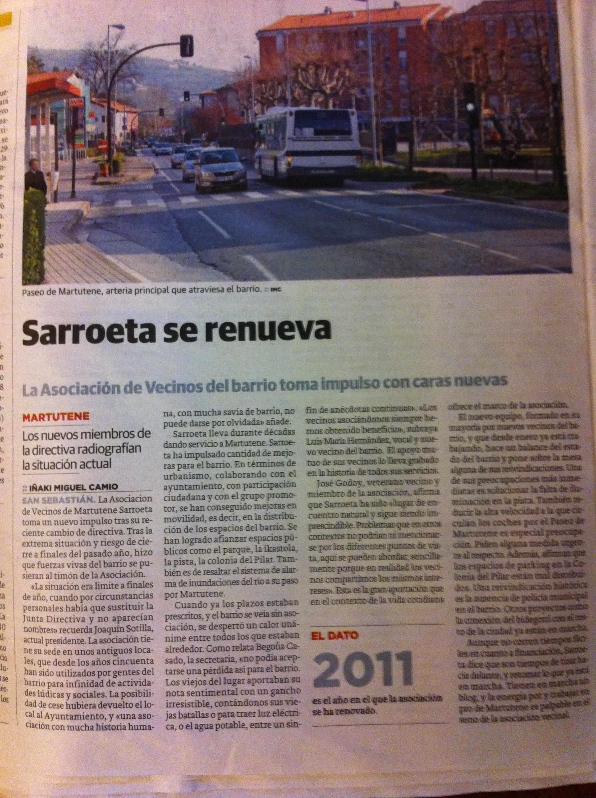 Entrevista a varios miembros de Sarroeta Elkartea publicada en el Diario Vasco el 28 de abril de 2011.