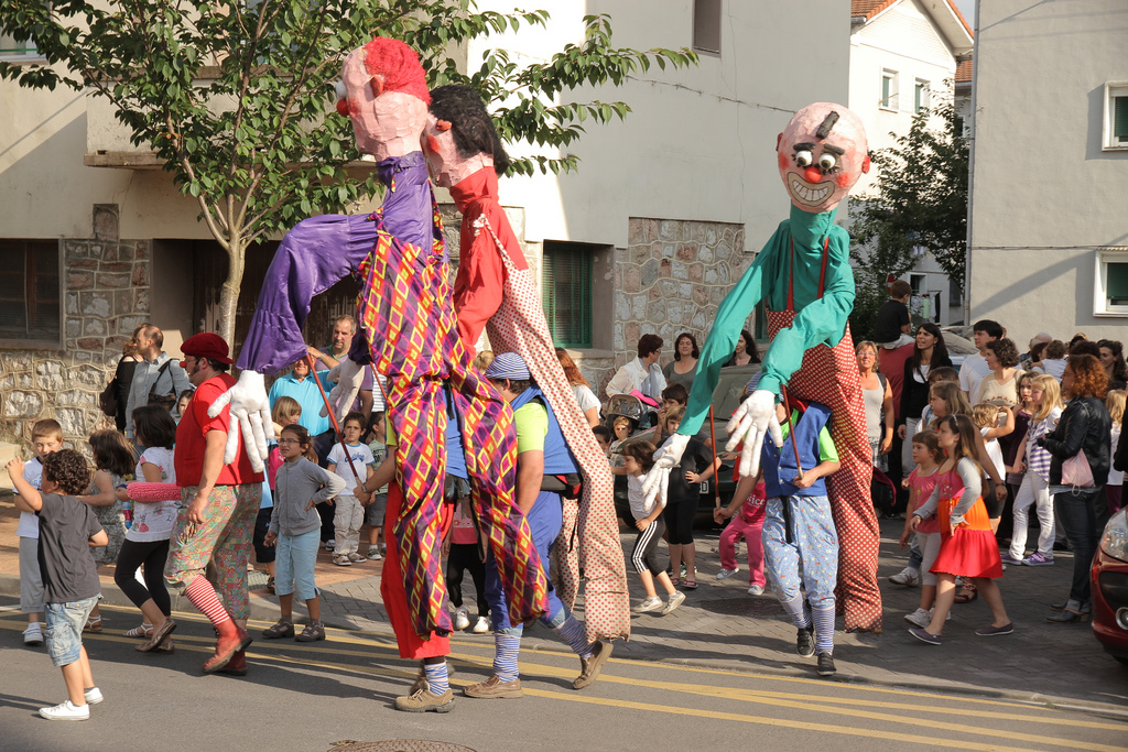Ayer por la tarde, una kale jira de payasos -con gigantes y elefante hinchable incluido- recorrió las calles de Martutene buscando niños a los que llevar a la actuación que dieron en el patio de la ikastola.