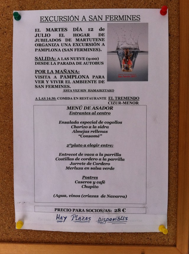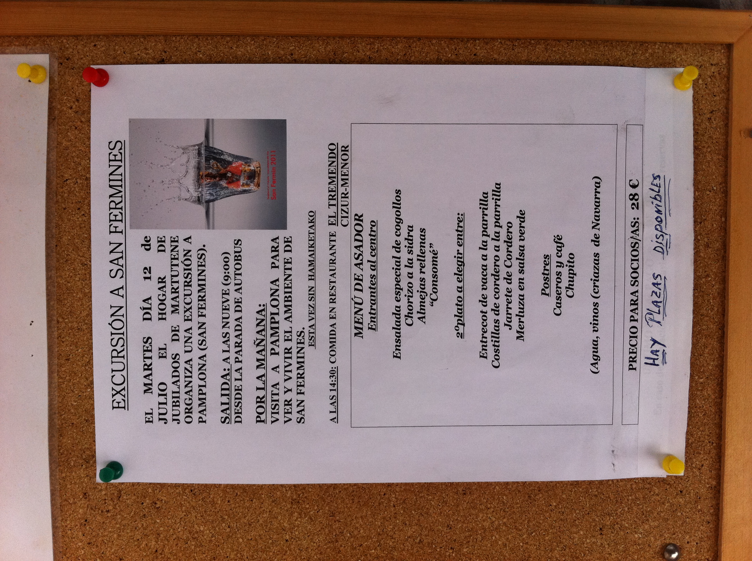 LURRARGI, la Asociación de jubilados de Martutene ha organizado una excursión a los sanfermines de Pamplona. Os dejo el cartel, con el menú y todo.