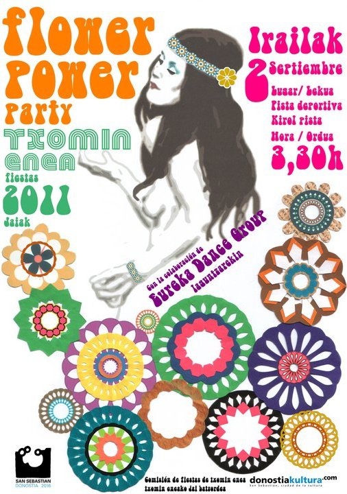 Cartel de la fiesta: Flower Power Party. El viernes actuará el grupo EUREKA DANCE GROUP, que ya estuvieron en las fiestas de Martutene el año pasado.