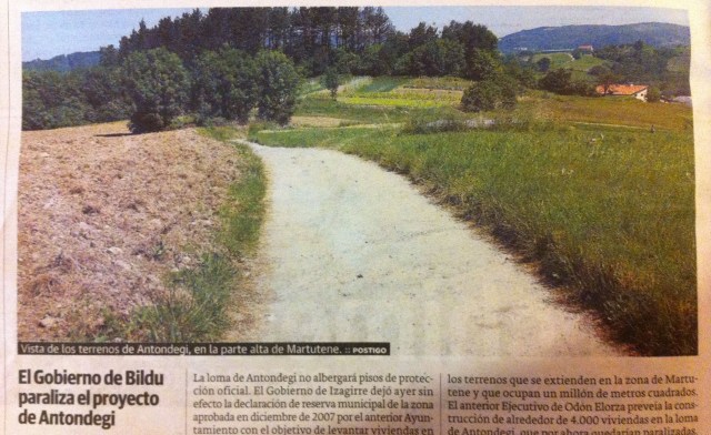 «La loma de Antondegi no albergará pisos de protección oficial. El Gobierno de Izagirre dejó ayer sin efecto la declaración de reserva municipal de la zona aprobada en diciembre de 2007 por el anterior Ayuntamiento con el objetivo de levantar viviendas en los terrenos que se extienden en la zona de Martutene y que ocupan un millón de metros cuadrados. El anterior Ejecutivo de Odón Elorza preveía la construcción de alrededor de 4.000 viviendas en la loma de Antondegi, que por ahora quedaría paralizadas.»