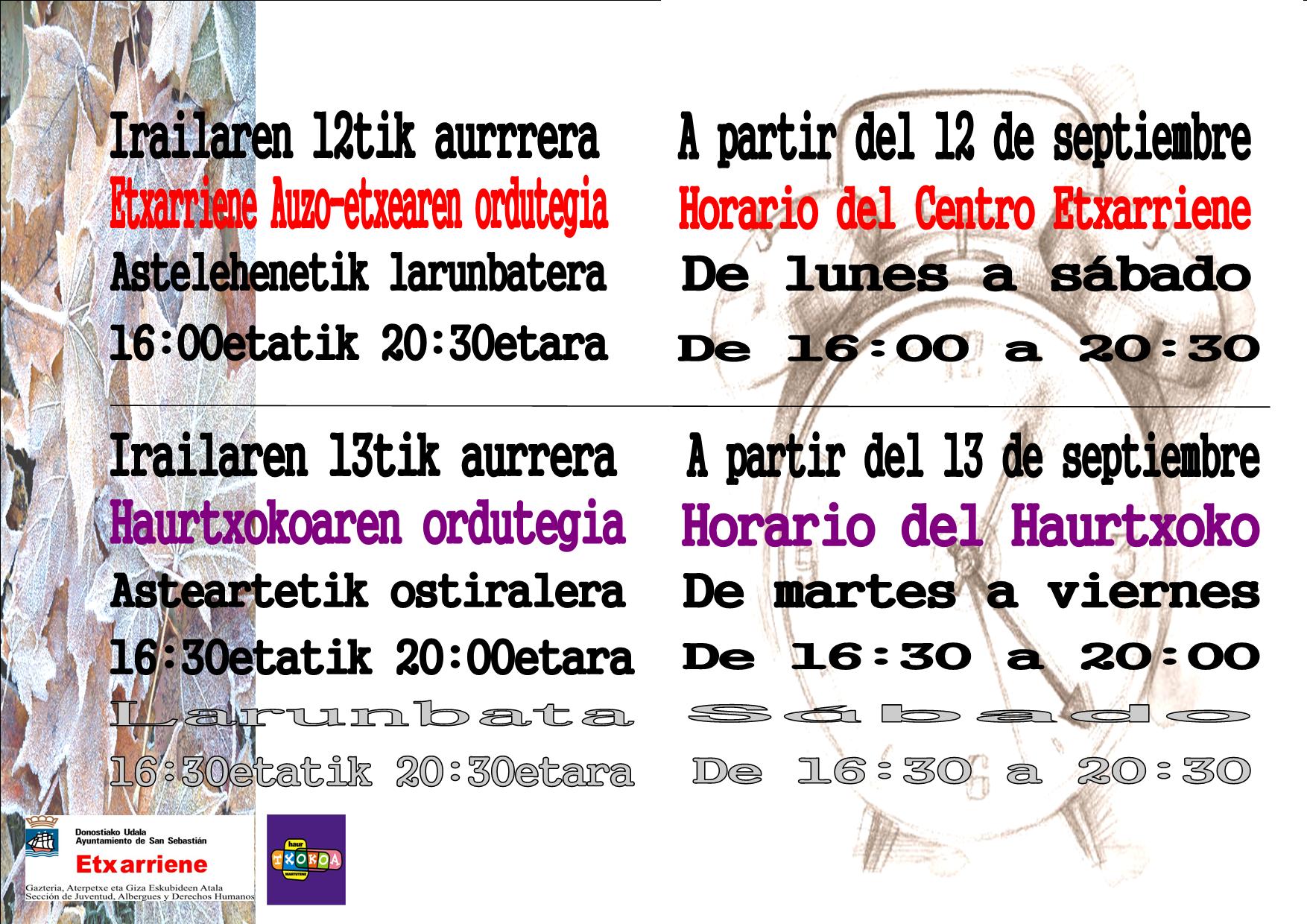 - Haurtxoko: abrirá el martes 13 de septiembre. Horario: de martes a viernes, 16:30-20:00. Sábados, 16:30-20:30.