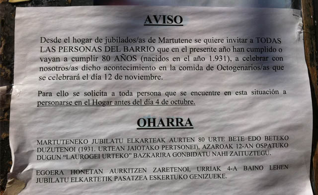 Desde la Asociación de Jubilados Lurrargi de Martutene se quiere invitar a todas las personas del barrio que en el presente año han cumplido o vayan a cumplir 80 años (nacidos en 1931) a celebrar con ellos dicho acontecimiento en la tradicional «Comida de Octogenarios» que se celebrará el 12 de noviembre.