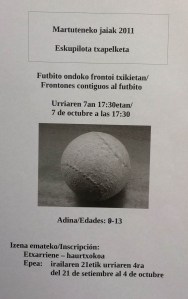 El próximo viernes 7 de octubre, y para abrir boca un día antes del txupinazo de fiestas, se celebrará el I Campeonato infantil de Pelota. La participación es abierta y gratuita para todos los nacidos entre 1998 y 2002. Hay que inscribirse en el Haurtxoko antes del 4 de octubre. El Campeonato se jugará de 17h a 19:30h el día 7 de octubre en el frontón de la Ikastola.
