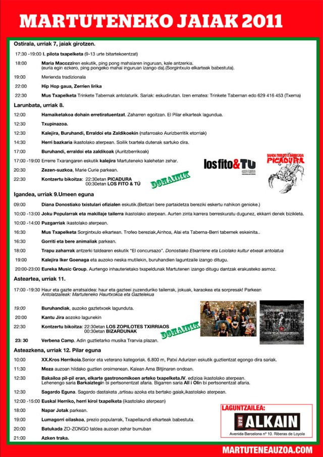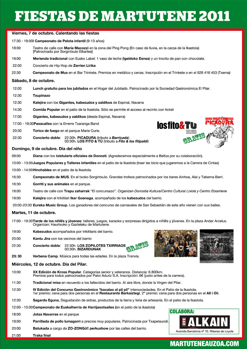 Archivado en Auzobizitza/Vida de barrio, Auzoko jaiak/Fiestas del Pilar, Jaiegunak/Festividades · Tagged with comisión de fiestas, conciertos, donostia, festak, Gipuzkoa, jaiak, martutene, programa fiestas, san sebastián