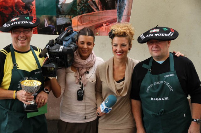 Los ganadores de la edición pasada, los hernaniarras de Sagardo Kofradia «Tolarea», posan con las periodistas de ETB.