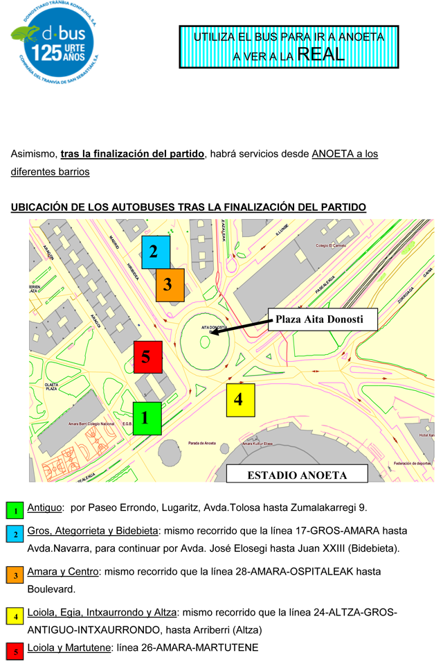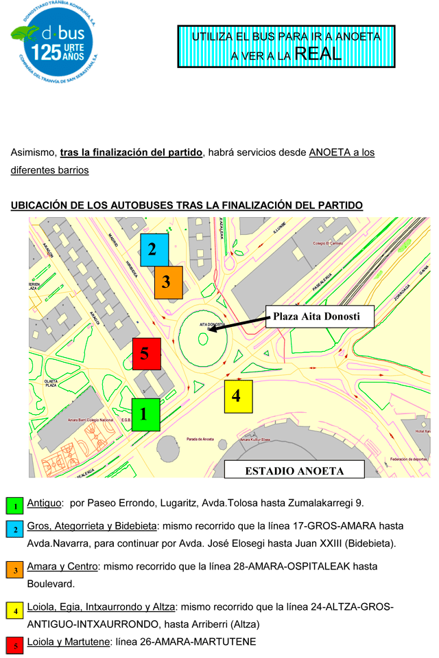 El domingo 23 de octubre de 2011, DBUS ofrece servicios especiales de autobuses desde los distintos barrios hasta Anoeta para el partido de fútbol entre la REAL SOCIEDAD y el GETAFE.