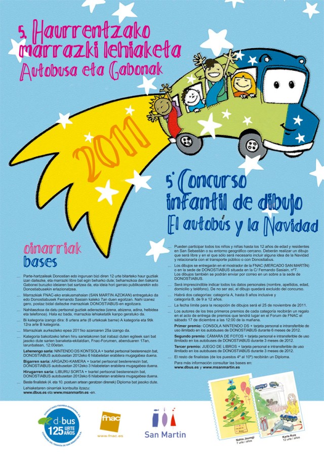 El 28 de agosto de 2011 la Compañía del Tranvía de San Sebastián ha cumplido 125 años y continuando con los actos conmemorativos este aniversario, DBUS y el MERCADO SAN MARTÍN han organizado la quinta edición del concurso de dibujo para niños: EL AUTOBÚS Y LA NAVIDAD. En esta nueva edición, esperamos que los dibujos sigan siendo tan imaginativos y creativos como en años anteriores.