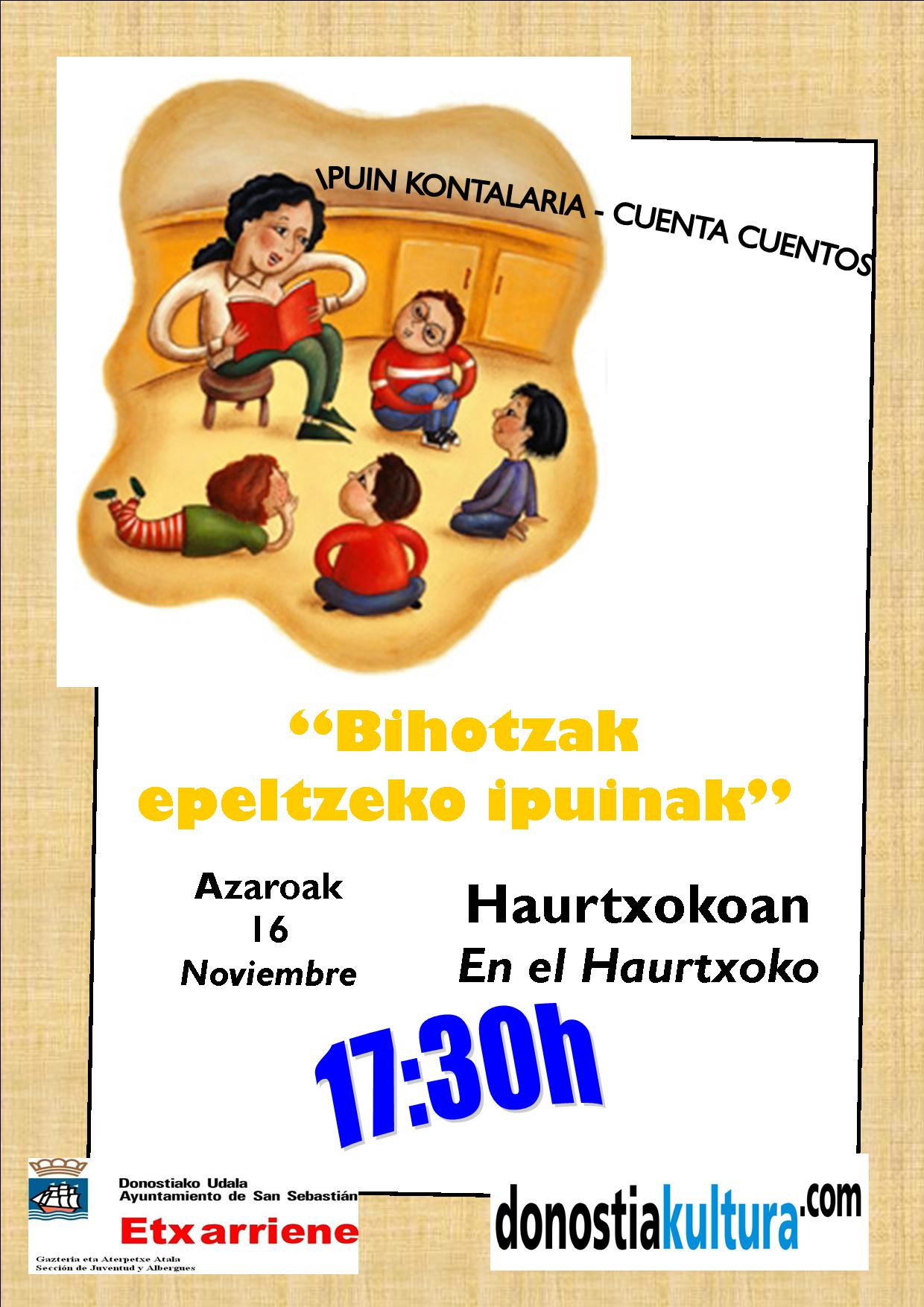 Archivado en Auzobizitza/Vida de barrio, Ekintzak/Actividades, Eragile sozialak/Agentes Sociales, Etxarriene, Kultura/Cultura, Partaidetza/Participación, Udaletxea/Ayuntamiento, Zerbitzuak/Servicios · Tagged with 16 noviembre, azaroak 16, bihotzak epeltzeko ipuinak, cuenta cuentos, donostia, donostia kultura, etxarriene, gazteria, haurtxoko martutene, ipuin kontalaria, juventud, loiola kultur etxea, saila, sección, udala, Udaletxea/Ayuntamiento