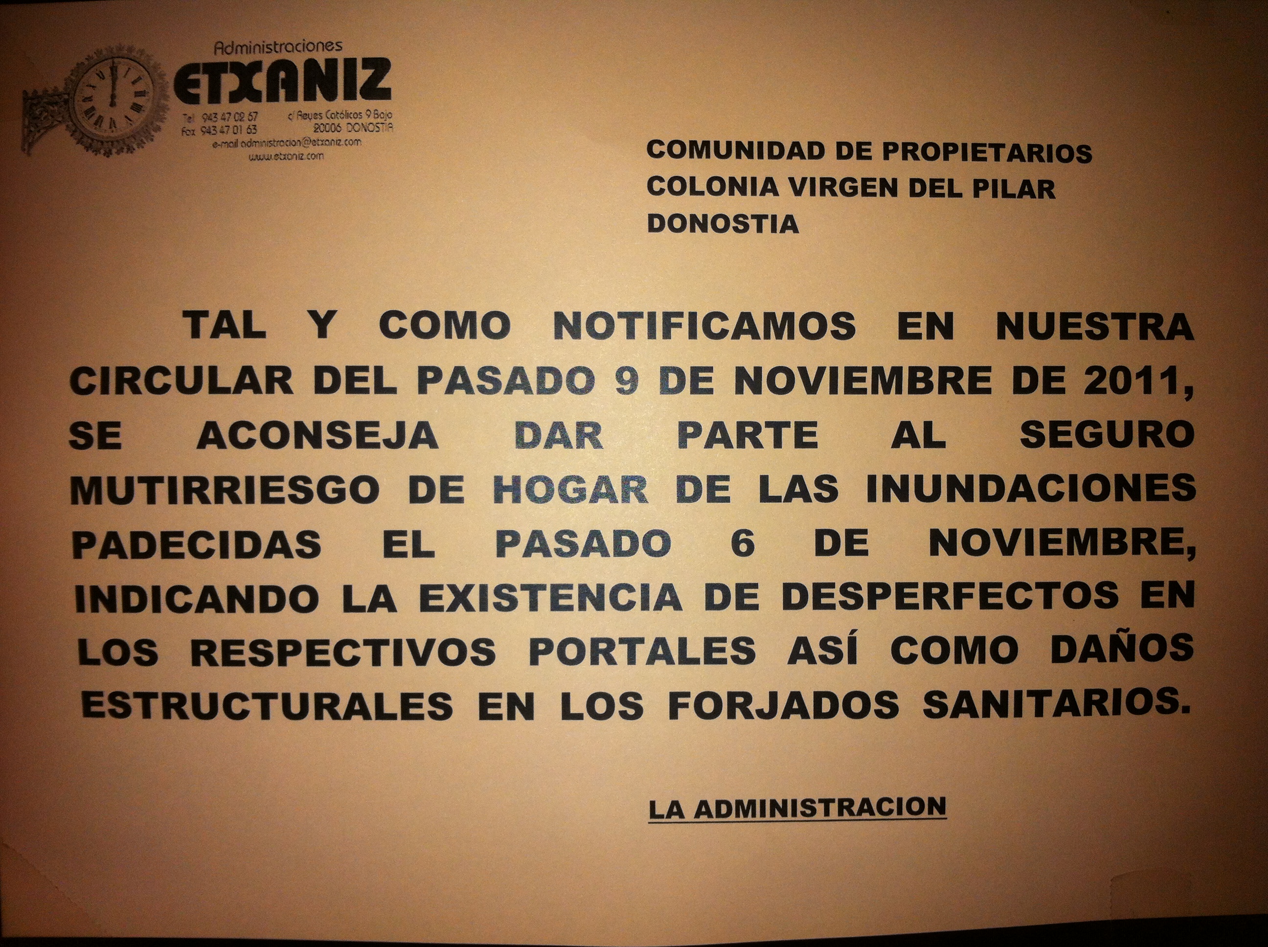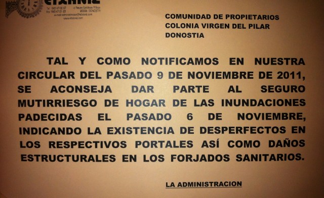 Archivado en uholdeak azaroaren 6an/inundaciones 6 de Noviembre · Tagged with administraciones, administrador, afectados, colonia del pilar, consorcio, damnificados, desperfectos, etxaniz, inundaciones, martutene, reclamación, seguros