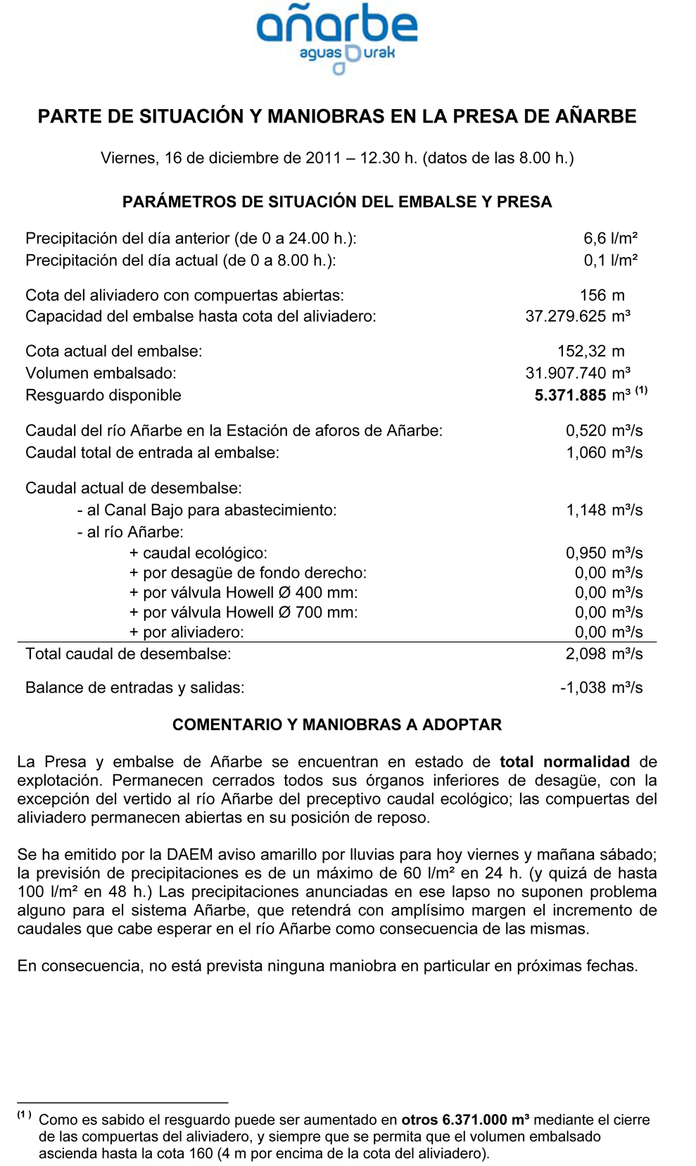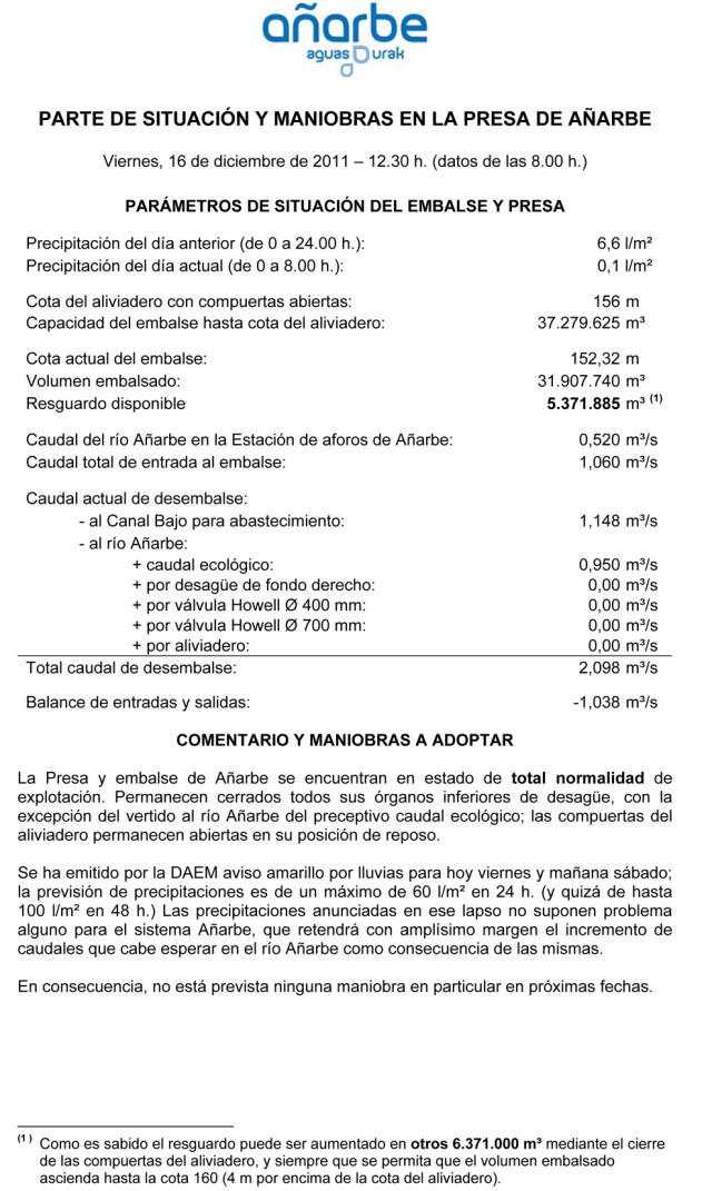 Adjunto se remite el parte descriptivo de la situación del Sistema Añarbe ante el aviso amarillo por precipitaciones emitido por la DAEM para los días de hoy y mañana, 16 y 17 de diciembre de 2011.