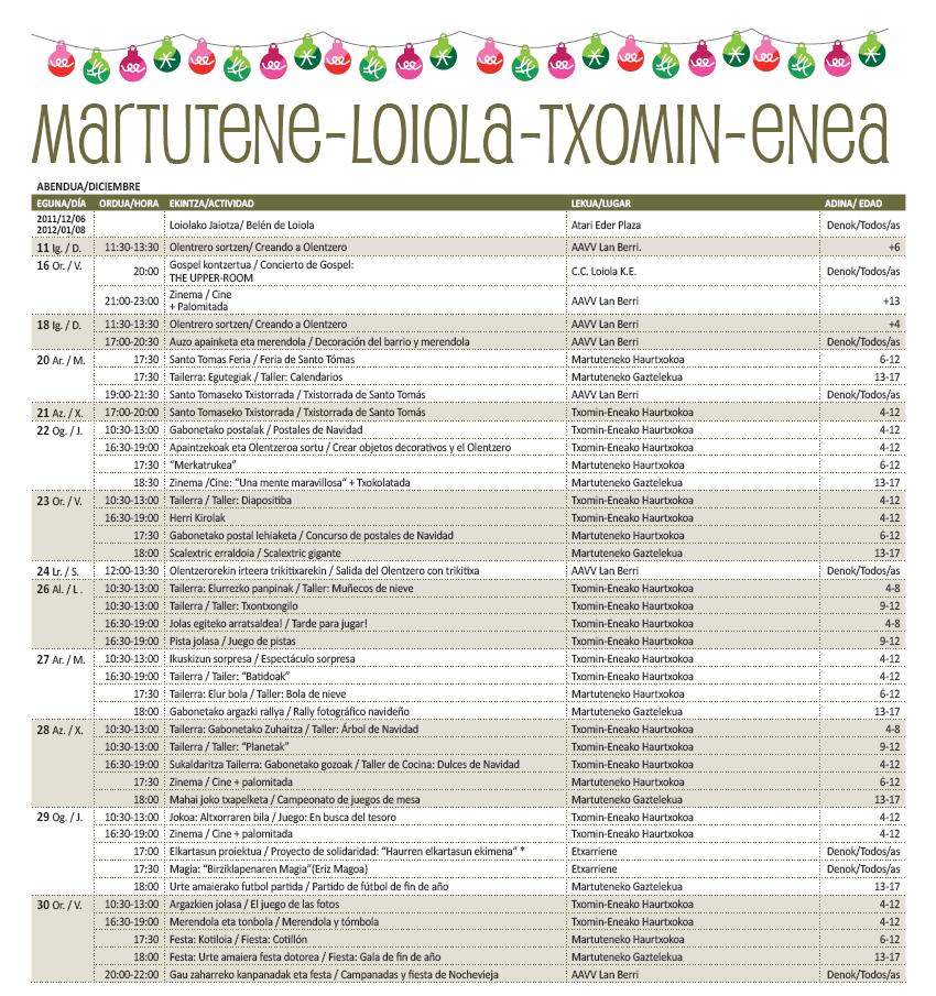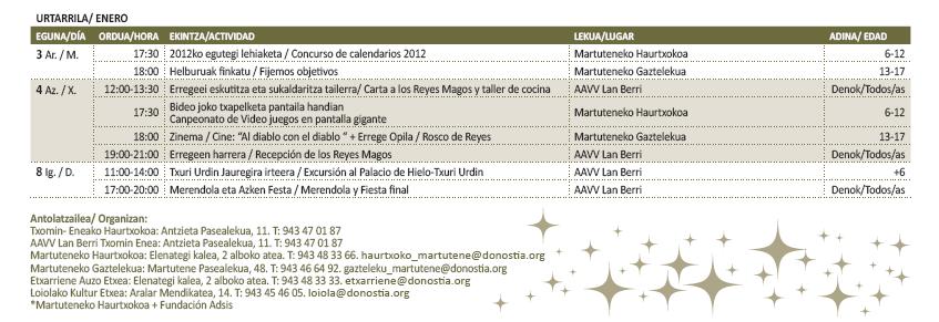 Archivado en Aisialdia/Ocio, Auzobizitza/Vida de barrio, Ekintzak/Actividades, Eragile sozialak/Agentes Sociales, Etxarriene, Iragarkiak/Anuncios, Kultura/Cultura, Partaidetza/Participación, Zerbitzuak/Servicios · Tagged with 2011, adolescente, etxarriene, gabonak zuretzat, gazteleku, haurrak, haurtxoko, martutene, nerabeak, niñas, niños, programación, programaketa