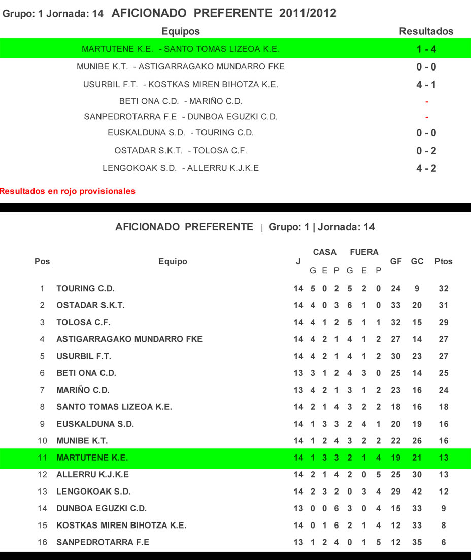Martutene K.E. – Jornada 14 (resultado y clasificación)