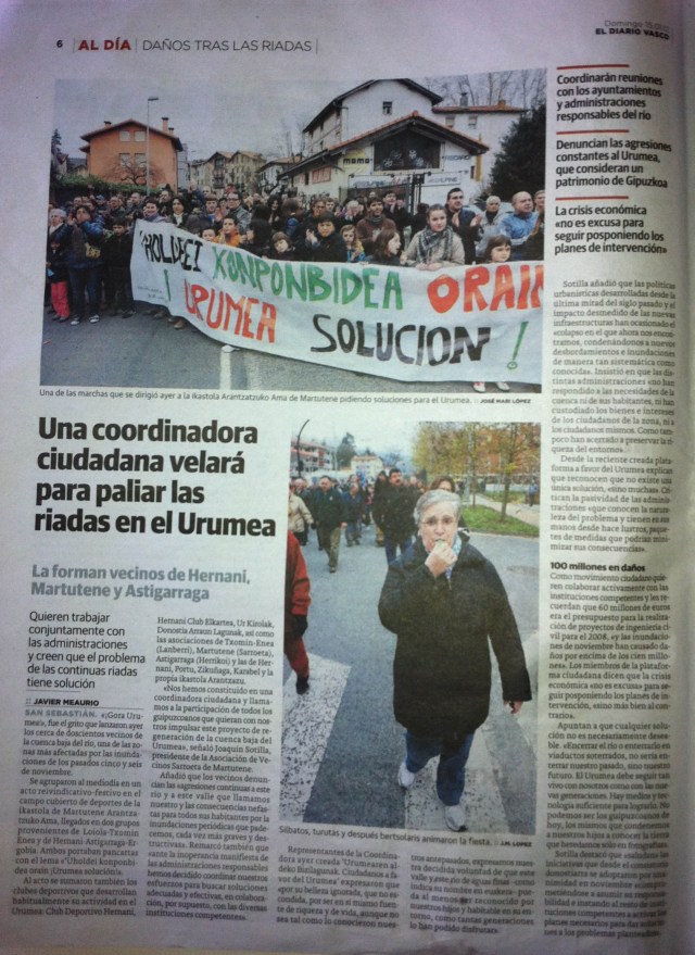 Una coordinadora ciudadana velará para paliar las riadas en el Urumea (Diario Vasco, 15 de Enero)