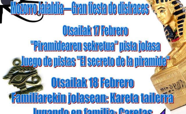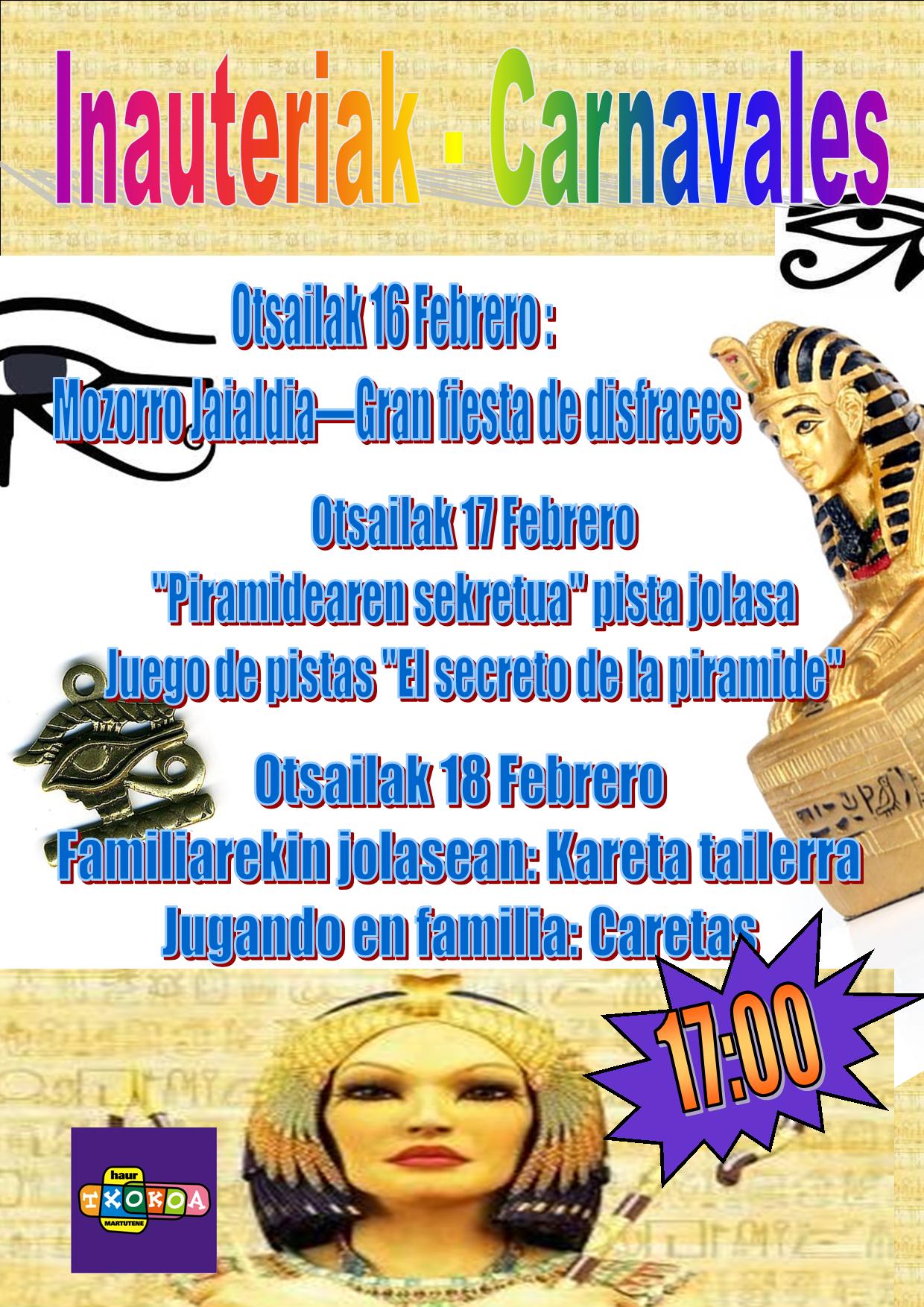 Archivado en Aisialdia/Ocio, Auzobizitza/Vida de barrio, Bizilagunak/Ciudadanos, Ekintzak/Actividades, Eragile sozialak/Agentes Sociales, Etxarriene, Iragarkiak/Anuncios, Jaiegunak/Festividades, Kultura/Cultura, Partaidetza/Participación, Udaletxea/Ayuntamiento, Zerbitzuak/Servicios · Tagged with caretas, carnavales, disfraces, etxarriene, familiarekin jolasea, febrero, fiesta, haurrak, haurtxoko, ihauteriak, jaialdia, jolasa, juego, jugando en familia, kareta, martutene, mozorro, niñas, niños, otsaila, piramidea, pista, pistas, programación, programaketa, secreto piramide, sekretua, tailerra, taller