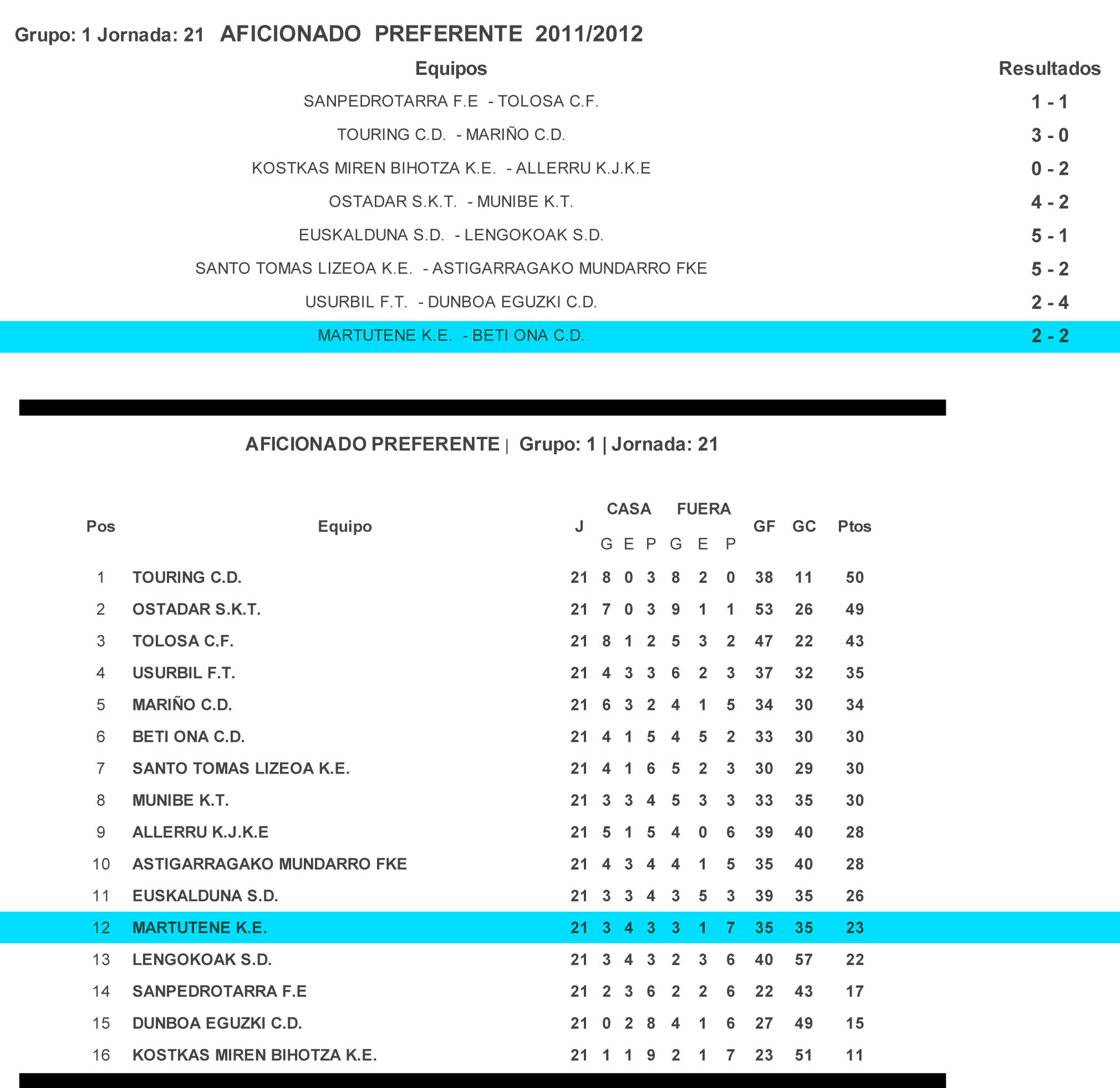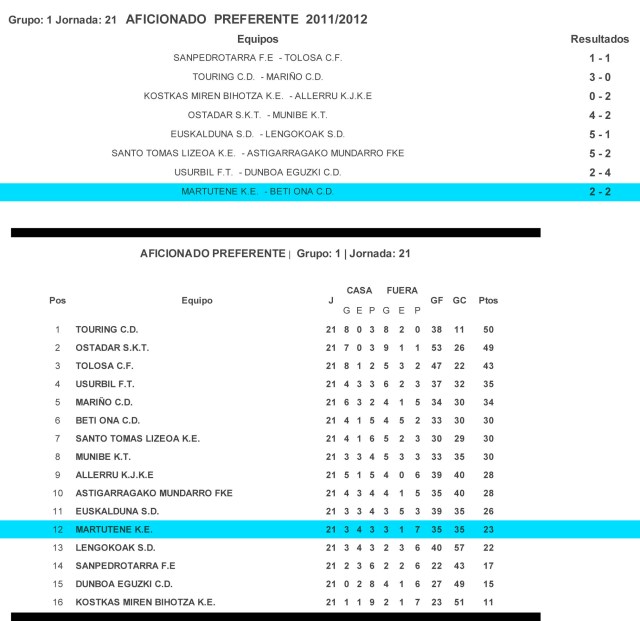 Archivado en Kirola/Deporte, Martutene Kirol Elkartea · Tagged with allerru, beti ona, derrota, donostia, dunboa, Dunboa Eguzki C.D., empate, euskalduna, fútbol, Federación Gipuzkoana de fútbol, Gipuzkoa, goles, kostkas miren bihotza, lengokoak, liga, mariño, martutene, martutene KE, MKE, mundarro, munibe, ostadar, Regional Preferente de Gipuzkoa, sanpedrotarra, tolosa, touring, ususrbil, victoria