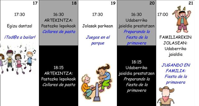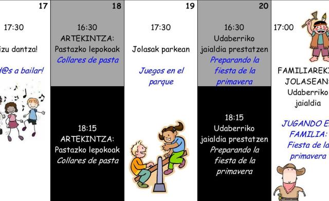 Archivado en Aisialdia/Ocio, Auzobizitza/Vida de barrio, Bizilagunak/Ciudadanos, Ekintzak/Actividades, Etxarriene, Haurtxoko, Iragarkiak/Anuncios, Partaidetza/Participación, Udaletxea/Ayuntamiento, Zerbitzuak/Servicios · Tagged with abril, apirila, artekintza, bailar, collar, dantza, egizu, etxarriene, fiesta, haurrak, haurtxoko, jaialdia, jolas, jugar, lepokoa, martutene, niñas, niños, parkea, parque, pasta, preparar, prestatu, primavera, programación, programaketa, todas, todos, udaberria