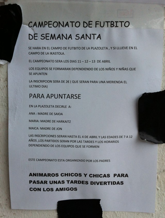Los días 11, 12 y 13 de Abril unas madres organizamos un campeonato de futbito para los niños del barrio por las tardes. Todos iba muy bien y la última tarde teníamos preparada también una merendola para celebrarlo. Amaneció lloviendo y pensamos en celebrar el último día en el patio de la Ikastola. Pero estaba cerrado. Preguntamos en el Gazteleku y se ofrecieron a llamar al Ayuntamiento. Cual fue nuestra sorpresa cuando nos dijeron que no había persona responsable para abrir las puertas del patio pero que tampoco el responsable del Gazteleku nos podía abrir la suya para poder acceder al campo.