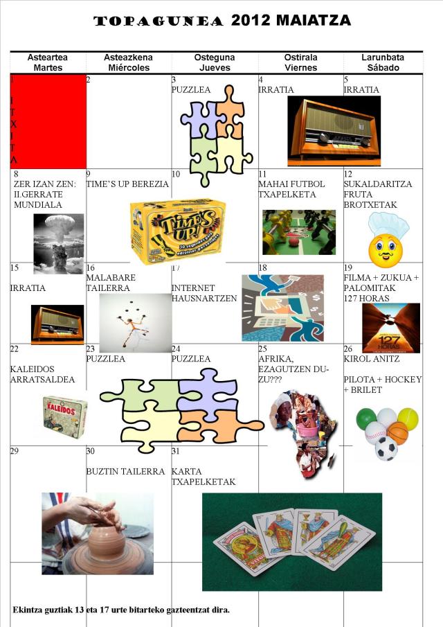 Archivado en Aisialdia/Ocio, Auzobizitza/Vida de barrio, Ekintzak/Actividades, Eragile sozialak/Agentes Sociales, Gazteleku, Iragarkiak/Anuncios, Partaidetza/Participación, Udaletxea/Ayuntamiento, Zerbitzuak/Servicios · Tagged with adolescentes, gazteleku, maiatza, martutene, mayo, nerabeak, programación, programaketa