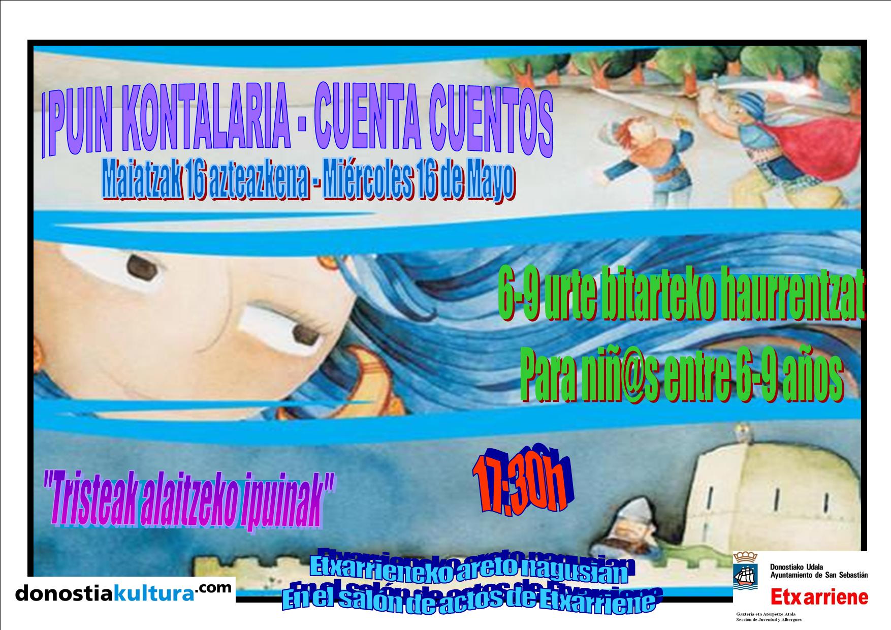 Archivado en Aisialdia/Ocio, Auzobizitza/Vida de barrio, Bizilagunak/Ciudadanos, Ekintzak/Actividades, Eragile sozialak/Agentes Sociales, Etxarriene, Iragarkiak/Anuncios, Loiola kultur etxea/ Centro Cultural de Loiola, Partaidetza/Participación, Udaletxea/Ayuntamiento, Zerbitzuak/Servicios · Tagged with alaitzeko, centro cultural, cuenta, cuentos, etxarriene, haurrak, ipuin, ipuinak, kontalari, kultur etxea, loiola, martutene, niñas, niños, tristeak