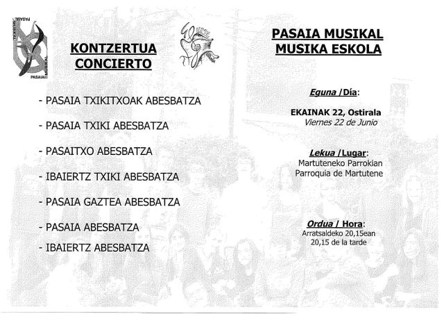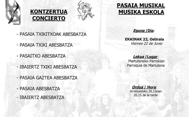 Archivado en Aisialdia/Ocio, Auzobizitza/Vida de barrio, Coro Ibaiertz abesbatza, Ekintzak/Actividades, Eragile sozialak/Agentes Sociales, Iragarkiak/Anuncios, Kultura/Cultura, Musika/Música, Partaidetza/Participación · Tagged with abesbatza, CONCIERTO, coro, escuela música, Ibaiertz, ibaiertz txiki, kontzertua, martutene, musika eskola, parrokia, parroquia, pasaia, pasaia gaztea, pasaia musikal, pasaia txiki, pasaia txikikoak