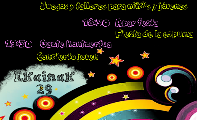 Archivado en Aisialdia/Ocio, Auzobizitza/Vida de barrio, Bizilagunak/Ciudadanos, Ekintzak/Actividades, Eragile sozialak/Agentes Sociales, Etxarriene, Gazteleku, Haurtxoko, Iragarkiak/Anuncios, Loiola kultur etxea/ Centro Cultural de Loiola, Partaidetza/Participación, Udaletxea/Ayuntamiento, Zerbitzuak/Servicios · Tagged with apar festa, centro cultural, CONCIERTO, espuma, etxarriene, fiesta, gazte, gazteleku, haurtxoko, joven, kontzertua, kultur etxea, loiola, martutene, mecánico, mekanikoa, toro, zezen