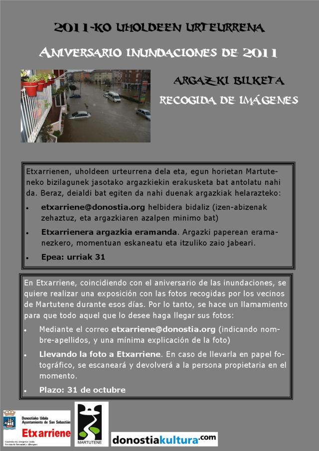 Archivado en Aisialdia/Ocio, Auzobizitza/Vida de barrio, Bizilagunak/Ciudadanos, Ekintzak/Actividades, Eragile sozialak/Agentes Sociales, Etxarriene, Iragarkiak/Anuncios, Partaidetza/Participación, Udaletxea/Ayuntamiento, uholdeak azaroaren 6an/inundaciones 6 de Noviembre, Urumea · Tagged with argazki, deialdia, erakusketa, exposición, foto, inundaciones, llamamiento, txarriene, uholdeak