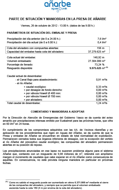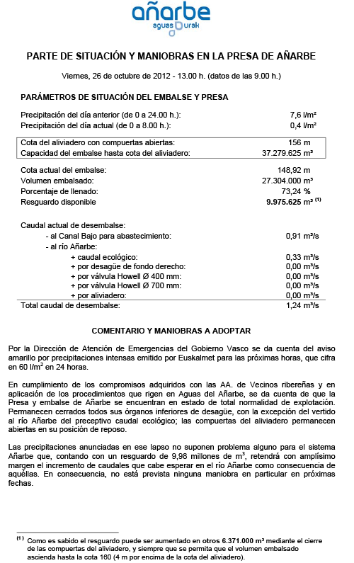 Recibimos un mail de Aguas del Añarbe con el parte de situación: