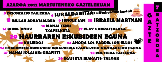 Archivado en Aisialdia/Ocio, Auzobizitza/Vida de barrio, Bizilagunak/Ciudadanos, Ekintzak/Actividades, Eragile sozialak/Agentes Sociales, Gazteleku, Iragarkiak/Anuncios, Partaidetza/Participación, Udaletxea/Ayuntamiento, Zerbitzuak/Servicios · Tagged with adolescentes, azaroa, gazteleku, martutene, nerabeak, noviembre, programación, programaketa