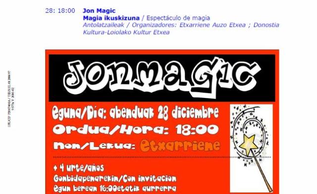 Archivado en Aisialdia/Ocio, Auzobizitza/Vida de barrio, Bizilagunak/Ciudadanos, Ekintzak/Actividades, Eragile sozialak/Agentes Sociales, Etxarriene, Iragarkiak/Anuncios, Kultura/Cultura, Loiola kultur etxea/ Centro Cultural de Loiola, Partaidetza/Participación, Udaletxea/Ayuntamiento, Zerbitzuak/Servicios · Tagged with abendua, centro cultural, diciembre, etxarriene, gabonak zuretzat, haurrak, jon magic, kultur etxea, loiola, magia, martutene, niñas, niños, programación, programaketa
