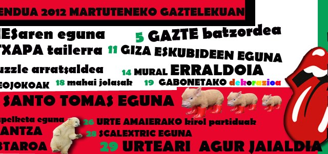 Archivado en Aisialdia/Ocio, Auzobizitza/Vida de barrio, Bizilagunak/Ciudadanos, Ekintzak/Actividades, Eragile sozialak/Agentes Sociales, Euskera, Gazteleku, Iragarkiak/Anuncios, Partaidetza/Participación, Udaletxea/Ayuntamiento, Zerbitzuak/Servicios · Tagged with abendua, adolescentes, diciembre, gazteleku, martutene, nerabeak, programación, programaketa