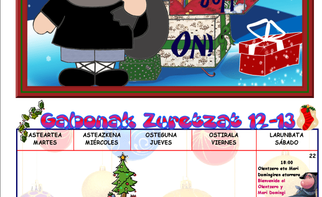 Archivado en Aisialdia/Ocio, Auzobizitza/Vida de barrio, Bizilagunak/Ciudadanos, Ekintzak/Actividades, Eragile sozialak/Agentes Sociales, Etxarriene, Haurtxoko, Iragarkiak/Anuncios, Jaiegunak/Festividades, Loiola kultur etxea/ Centro Cultural de Loiola, Partaidetza/Participación, Udaletxea/Ayuntamiento, Zerbitzuak/Servicios · Tagged with 2012, gabonak, gabonak zuretzat, haurra, haurtxoko, mari domingi, martutene, navidad, niñas, niños, olentzero, programazioa