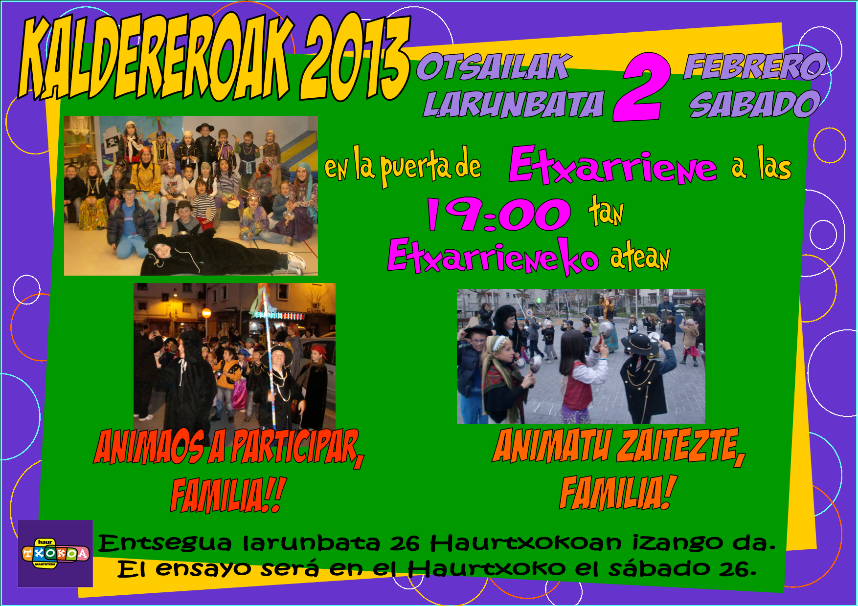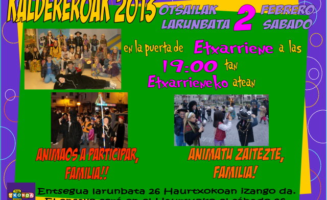 Archivado en Aisialdia/Ocio, Auzobizitza/Vida de barrio, Bizilagunak/Ciudadanos, Ekintzak/Actividades, Eragile sozialak/Agentes Sociales, Etxarriene, Haurtxoko, Iragarkiak/Anuncios, Jaiegunak/Festividades, Partaidetza/Participación, Udaletxea/Ayuntamiento, Zerbitzuak/Servicios · Tagged with caldereros, enero, etxarriene, familiak, familiarekin jolasean, familias, febrero, haurrak, haurtxoko, jugando en familia, kaldereroak, martutene, niñas, niños, otsaila, programación, programaketa, urtarrila