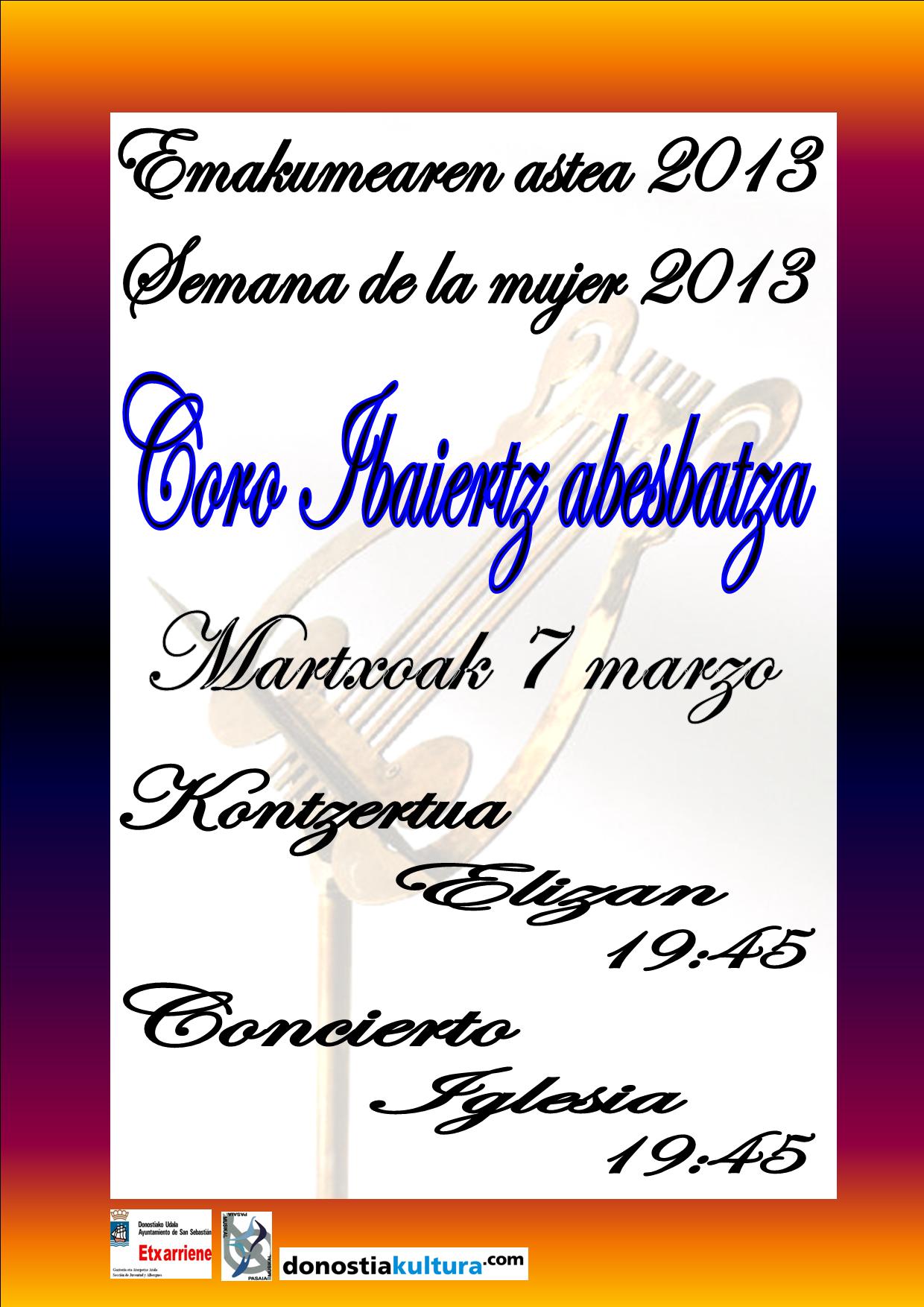 Archivado en Aisialdia/Ocio, Auzobizitza/Vida de barrio, Bizilagunak/Ciudadanos, Coro Ibaiertz abesbatza, Ekintzak/Actividades, Eragile sozialak/Agentes Sociales, Etxarriene, Iragarkiak/Anuncios, Kultura/Cultura, Loiola kultur etxea/ Centro Cultural de Loiola, Musika/Música, Partaidetza/Participación, Udaletxea/Ayuntamiento, Zerbitzuak/Servicios · Tagged with abesbatza, centro cultural, CONCIERTO, coro, día de la mujer, emakumearen astea, emakumearen eguna, etxarriene, Ibaiertz, josu elberdin, kontzertua, korua, kultur etxea, loiola, martutene, martxoa, marzo, programación, programazioa, semana de la mujer