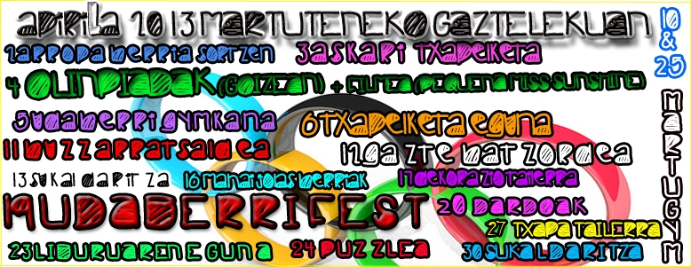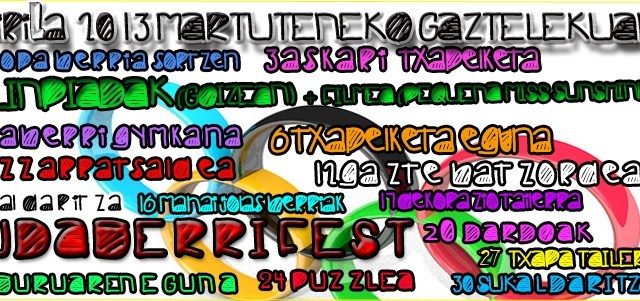 Archivado en Aisialdia/Ocio, Auzobizitza/Vida de barrio, Bizilagunak/Ciudadanos, Ekintzak/Actividades, Eragile sozialak/Agentes Sociales, Gazteleku, Iragarkiak/Anuncios, Partaidetza/Participación, Udaletxea/Ayuntamiento, Zerbitzuak/Servicios · Tagged with 2013, abril, adolescentes, apirila, gazteak, gazteleku, jóvenes, martutene, nerabeak, programación, programazioa