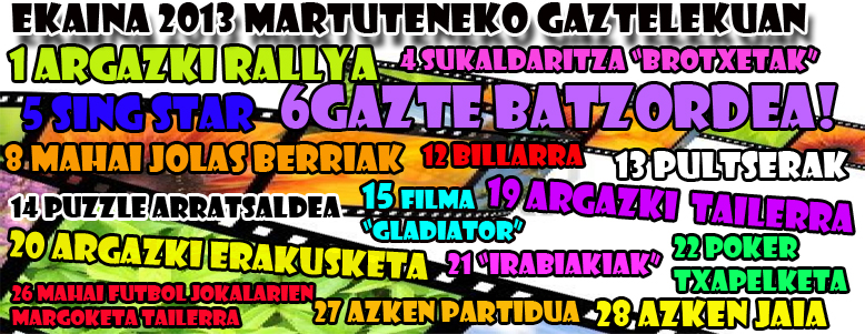 Archivado en Aisialdia/Ocio, Auzobizitza/Vida de barrio, Bizilagunak/Ciudadanos, Ekintzak/Actividades, Eragile sozialak/Agentes Sociales, Gazteleku, Iragarkiak/Anuncios, Partaidetza/Participación, Udaletxea/Ayuntamiento, Zerbitzuak/Servicios · Tagged with adolescentes, ekaina, gazteak, gazteleku, jóvenes, junio, martutene, nerabeak, programación, programaketa