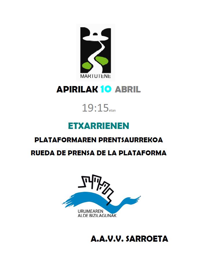 Urumearen Alde Bizilagunak Plataforma: prentsaurrekoa / rueda de prensa. Apirilak 10 Abril, 19:15 Etxarriene