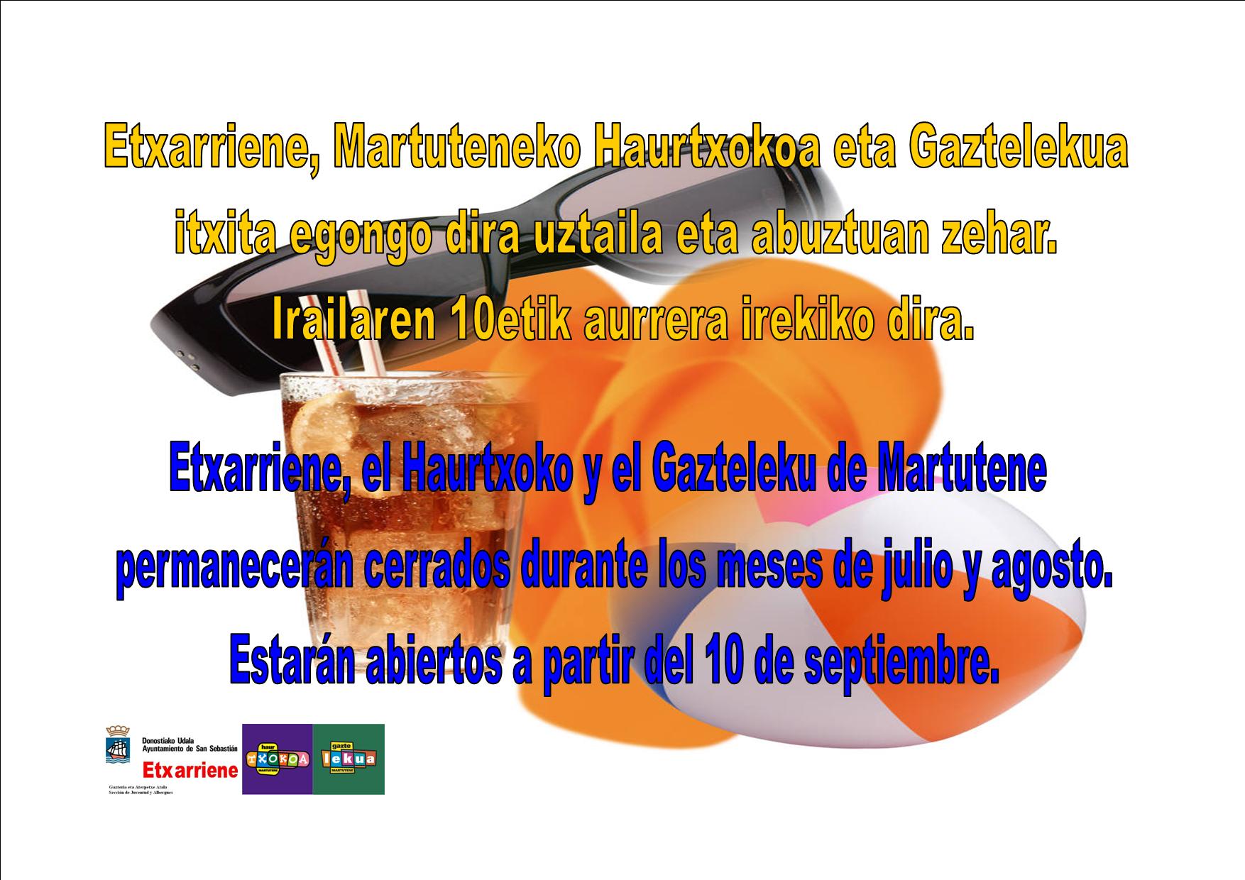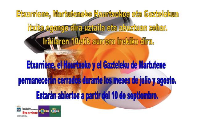 Etxarriene, Martuteneko Haurtxokoa eta Gaztelekua itxita egongo dira uztaila eta abuztuan zehar.