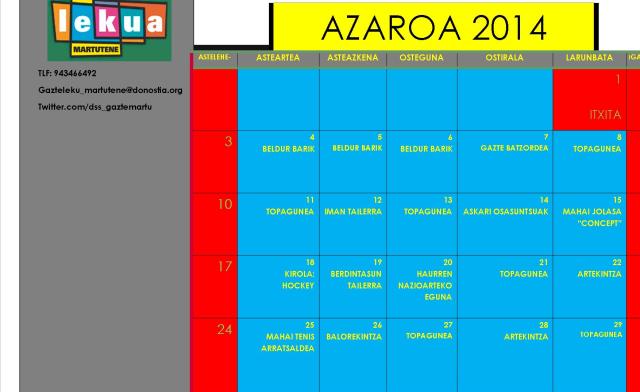 Archivado en Aisialdia/Ocio, Auzobizitza/Vida de barrio, Bizilagunak/Ciudadanos, Ekintzak/Actividades, Eragile sozialak/Agentes Sociales, Etxarriene, Gazteleku, Iragarkiak/Anuncios, Partaidetza/Participación, Udaletxea/Ayuntamiento, Zerbitzuak/Servicios · Tagged with 2014, azaroa, etxarriene, gazteleku, martutene, noviembre, programación, programaketa