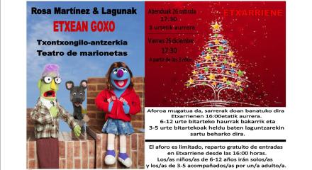 Archivado en Aisialdia/Ocio, Auzobizitza/Vida de barrio, Bizilagunak/Ciudadanos, Ekintzak/Actividades, Eragile sozialak/Agentes Sociales, Etxarriene, Haurtxoko, Iragarkiak/Anuncios, Partaidetza/Participación, Udaletxea/Ayuntamiento, Zerbitzuak/Servicios · Tagged with antzerkia, etxarriene, etxean, gabonak, goxo, haurtxoko, marionetas, martutene, programación, programaketa, teatro, txotxongilo, zuretzat