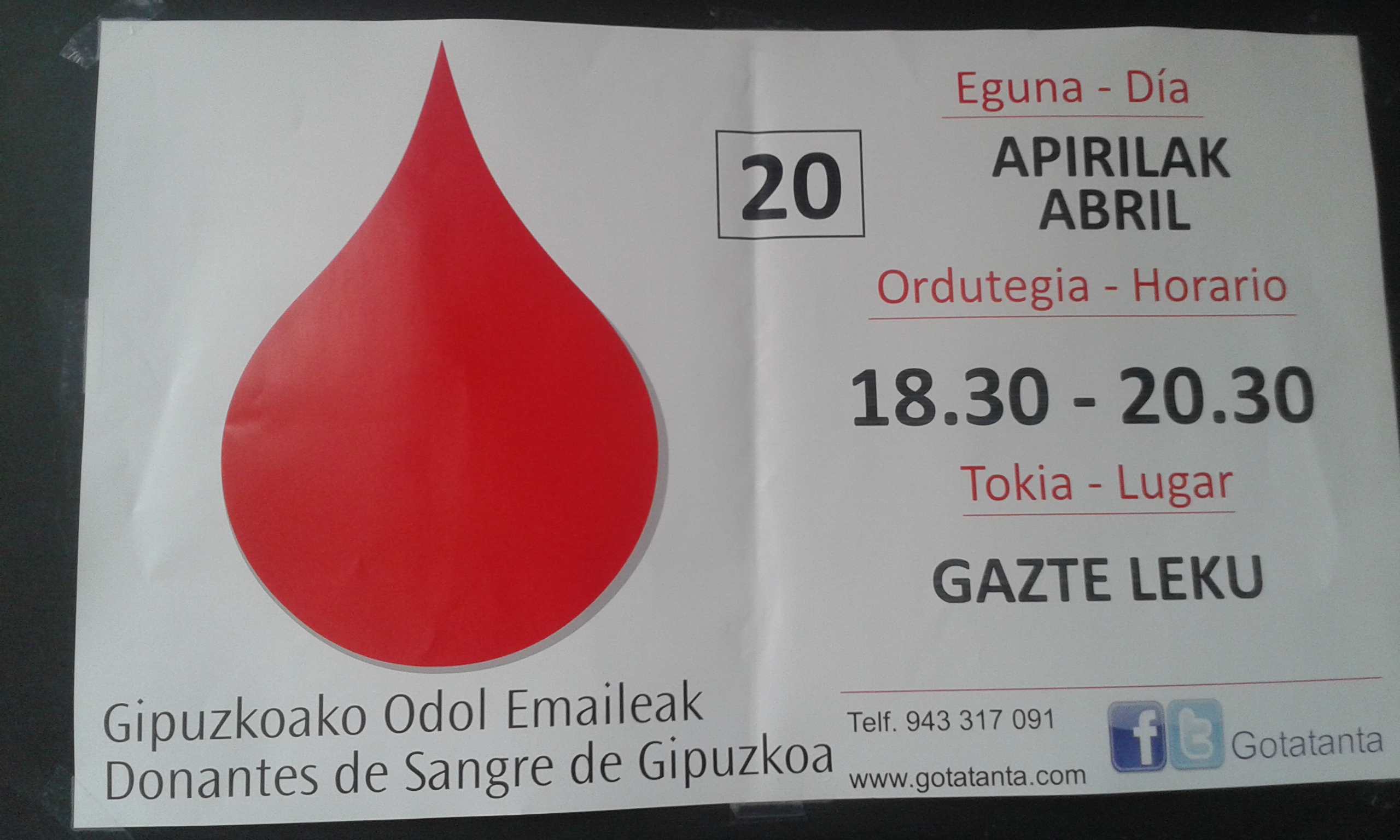 Gogoratu! / ¡Recordad! Gaur / Hoy: odol emaileak / donantes de sangre, 18:30-20:30 Gaztelekua