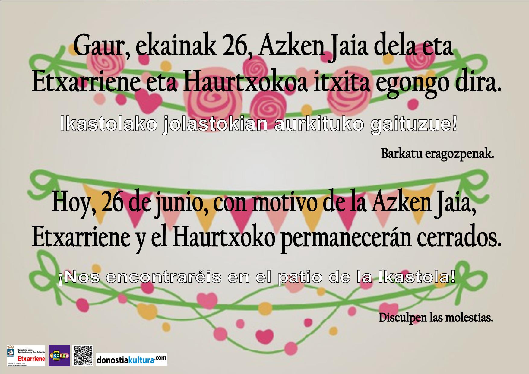 Oharra!! Ekainak 26 Etxarriene eta Haurtxokoa itxita / ¡¡Aviso!! 26 de junio Etxarriene y Haurtxoko cerrados