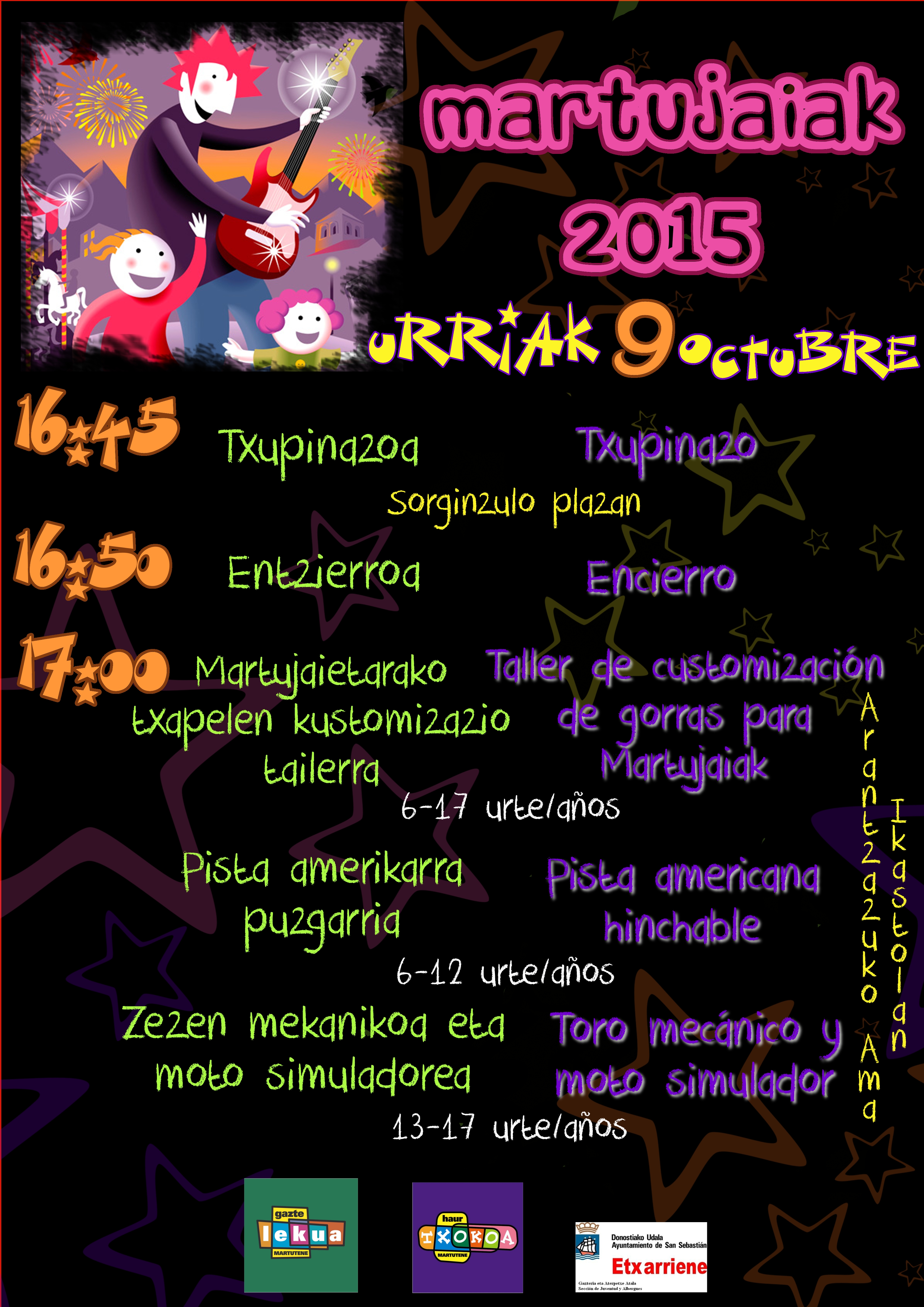 Archivado en Aisialdia/Ocio, Auzobizitza/Vida de barrio, Bizilagunak/Ciudadanos, Ekintzak/Actividades, Eragile sozialak/Agentes Sociales, Etxarriene, Gazteleku, Haurtxoko, Iragarkiak/Anuncios, Partaidetza/Participación, Udaletxea/Ayuntamiento, Zerbitzuak/Servicios · Tagged with auzoa, barrio, fiestas, haurrak, jaiak, jóvenes, martutene, nerabeak, niñas, niños, octubre, programación, programaketa, urria, Urumea