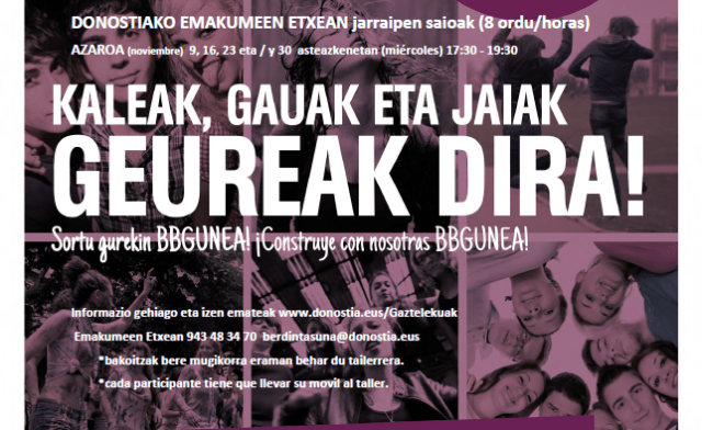 profesionales expertos en el tema, en colaboración con el Departamento de Igualdad del Ayuntamiento de San Sebastián. El taller está dirigido a chicas y lo haremos con un grupo cerrado en una sala del Gazteleku.