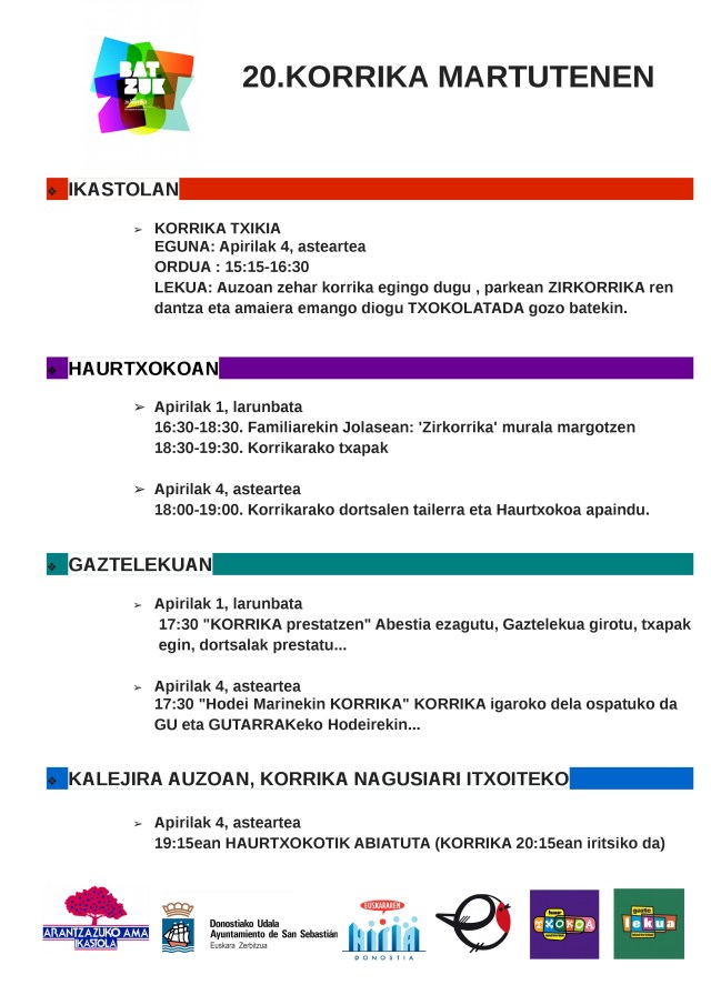 Archivado en Aisialdia/Ocio, Auzobizitza/Vida de barrio, Bizilagunak/Ciudadanos, Ekintzak/Actividades, Eragile sozialak/Agentes Sociales, Etxarriene, Gazteleku, Haurtxoko, Iragarkiak/Anuncios, Partaidetza/Participación, Udaletxea/Ayuntamiento, Zerbitzuak/Servicios · Tagged with abril, actividades, apirila, arratsaldea, auzoa, barrio, ekintzak, etxarriene, euskara, euskera, gaztelekua, haurtxokoa, ikastola, korrika, martutene, tarde, txantxangorria