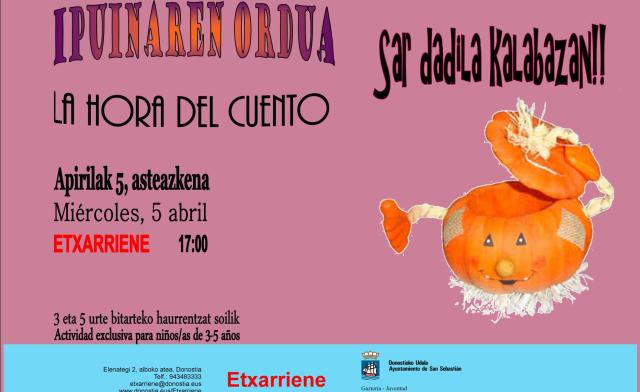 Archivado en Aisialdia/Ocio, Auzobizitza/Vida de barrio, Bizilagunak/Ciudadanos, Ekintzak/Actividades, Eragile sozialak/Agentes Sociales, Etxarriene, Iragarkiak/Anuncios, Partaidetza/Participación, Udaletxea/Ayuntamiento, Zerbitzuak/Servicios · Tagged with abril, apirila, arratsaldea, asteazkena, auzoa, barrio, cuento, cultura, etxarriene, haurrak, ipuina, kultura, martutene, miércoles, niñas, niños, tarde