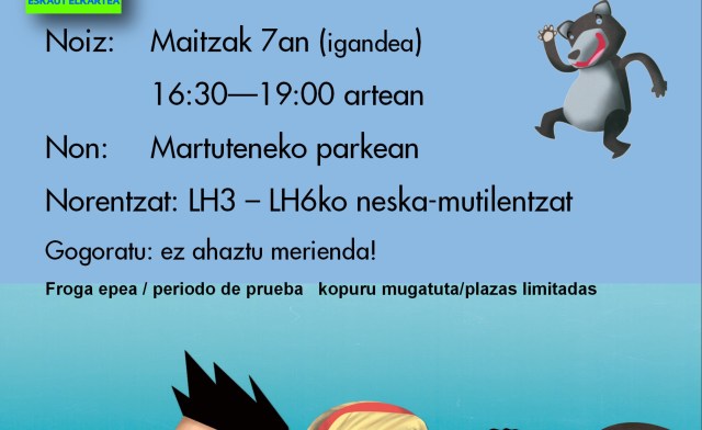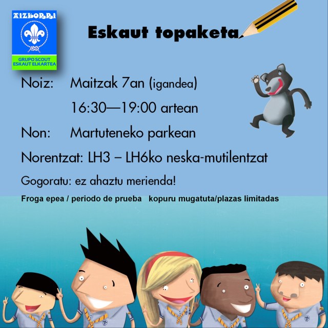 Archivado en Aisialdia/Ocio, Auzobizitza/Vida de barrio, Bizilagunak/Ciudadanos, Ekintzak/Actividades, Eragile sozialak/Agentes Sociales, Etxarriene, Gazteleku, Haurtxoko, Iragarkiak/Anuncios, Partaidetza/Participación, Udaletxea/Ayuntamiento, Zerbitzuak/Servicios · Tagged with aste burua, auzoa, barrio, domingo, fin de semana, igandea, maiatza, martutene, mayo, Mendia, monte, quedada, scout, topaketa