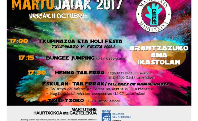 Archivado en Aisialdia/Ocio, Auzobizitza/Vida de barrio, Bizilagunak/Ciudadanos, Ekintzak/Actividades, Eragile sozialak/Agentes Sociales, Etxarriene, Gazteleku, Haurtxoko, Iragarkiak/Anuncios, Partaidetza/Participación, Udaletxea/Ayuntamiento, Zerbitzuak/Servicios · Tagged with auzoa, barrio, festa, fiestas, gaztelekua, haurrak, haurtxokoa, holi, ikastola, jaiak, martutene, niñas, niños, octubre, tailerrak, talleres, urria