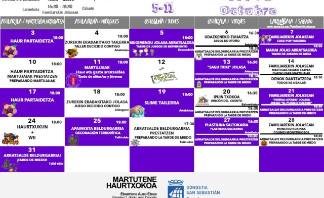 El Haurtxoko de Martutene, situado en Etxarriene, continuará con su programación de octubre. Dentro de ella, esta semana l@s niñ@s de 5 a 11 años podrán participar en las siguientes actividades:
