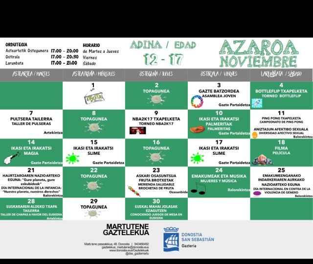 Archivado en Aisialdia/Ocio, Auzobizitza/Vida de barrio, Bizilagunak/Ciudadanos, Ekintzak/Actividades, Eragile sozialak/Agentes Sociales, Etxarriene, Gazteleku, Iragarkiak/Anuncios, Partaidetza/Participación, Udaletxea/Ayuntamiento, Zerbitzuak/Servicios · Tagged with actividades, astea, auzoa, azaroa, barrio, ekintzak, gazteak, gaztelekua, hilabetea, jóvenes, larunbata, martutene, mes, noviembre, programación, programaketa, sábado, semana, tailerrak, talleres